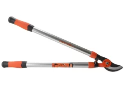 Bahco PG-19 Expert Bypass Loppers with telescopic handles made of silver aluminium tubes, extendable from 65 – 90cm. The special locking system locks and unlocks with just a quarter-turn. The loppers have an exchangeable rubber buffer and comfortable bi-material grips made of orange polypropylene and soft black thermoplastic elastomer.