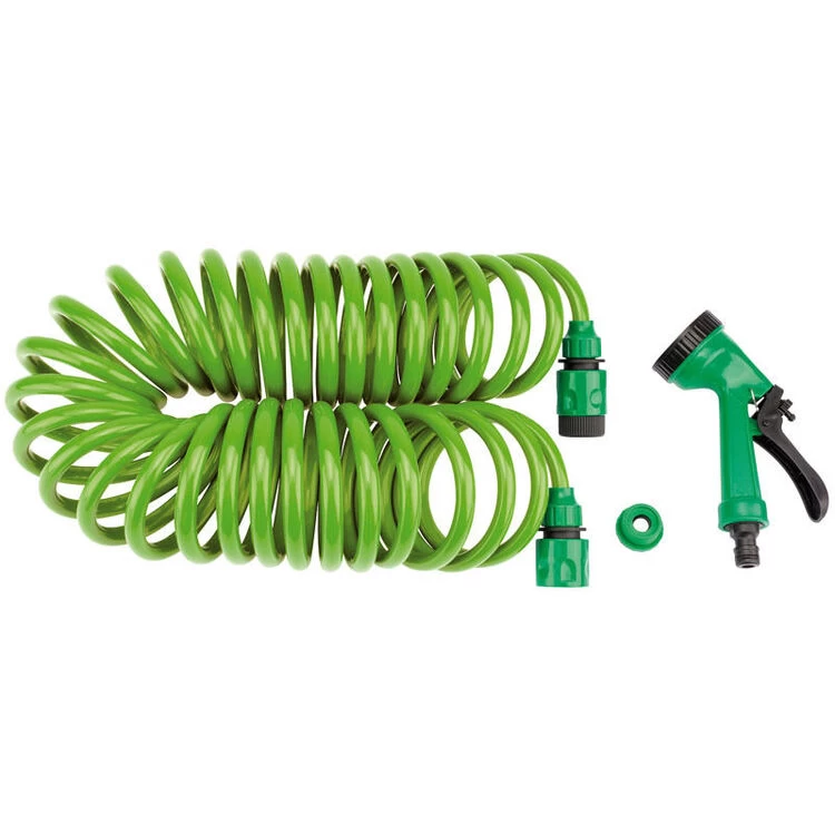 Hose kits comprising 10m or 30m (working lengths) 3/8″ diameter recoil hose, 1/2″ tap connector and five pattern spray gun. Display packed.