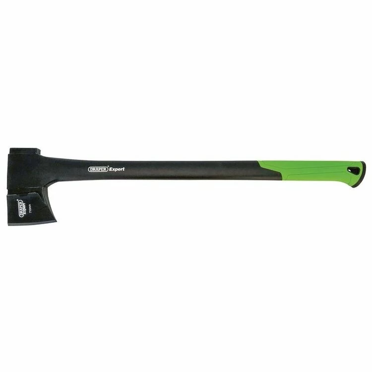 Splitting axe manufactured from high carbon steel, hardened and tempered with chemically blackened cheeks and ground cutting edge. The fibreglass core handle features a soft grip for comfort and to maximize control when in use. Supplied with a safety storage holster.