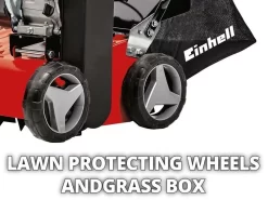 Equipped with large wheels for effortless operation, even in difficult soil conditions. The 45-litre catch bag is large enough for long, uninterrupted work sessions. To protect the blades and the standing surface there is a parking position. It has a robust, long-lasting metal housing and a long, folding handle for storage in minimum space.
