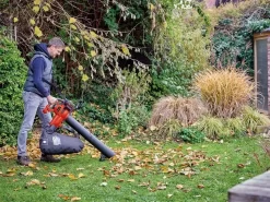 For maximum blowing power, there is an integrated turbo switch. Electronic speed enables power on your preference. An ergonomic handle with a soft grip and anti-vibration function makes handling easy and comfortable. There is also an adjustable additional handle and an adjustable carrying strap for added comfort. Fitted with two, height-adjustable guide wheels. The cleaning opening is fitted with a safety switch and there is a 45 litre catch bag with a window so that you can always see how full it is.