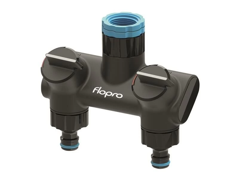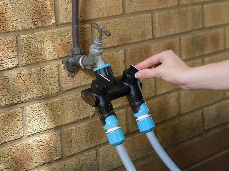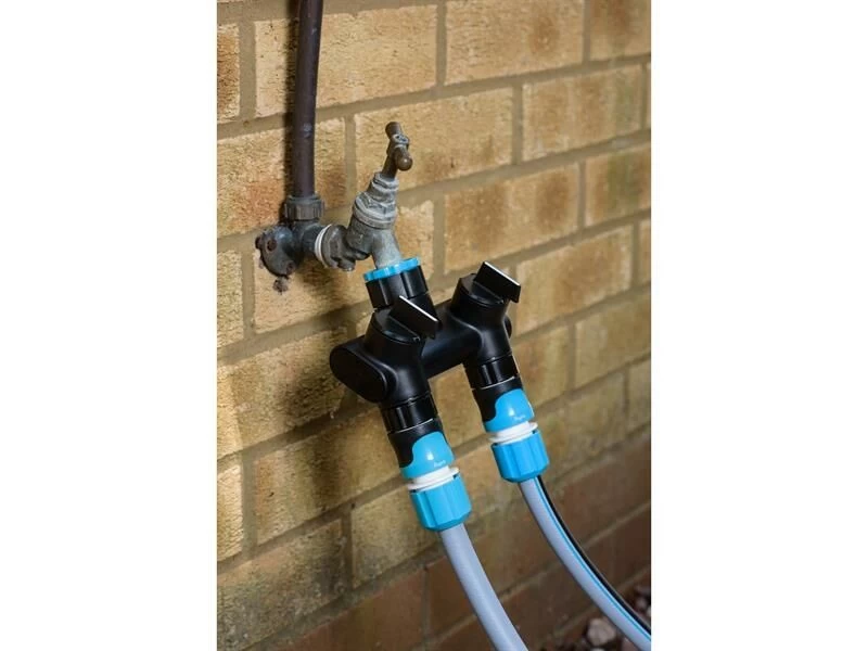 The Flopro Double Outside Tap Connectors can be used for joining two hoses to a single outside tap. You can use one or both hoses and water flow can be individually adjusted.